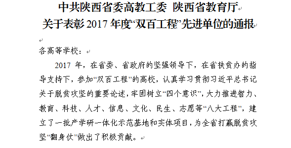 近日,省委高教工委、省教育厅印发《中共陕西省委高教工委 陕西省教育厅关于表彰2017年度“双百工程”先进单位的通报》(陕高教扶〔2018〕13号),公布了全省参加“双百工程”的103所高校的考核结果,williamhill获评2017年度“双百工程”先进单位称号。