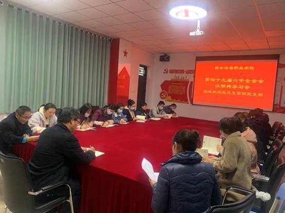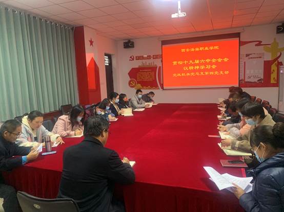 11月23日下午,党政机关第一总支第四党支部全体党员在1号教学楼党员活动室召开支部大会,深入学习《中国共产党第十九届中央委员会第六次全体会议公报》和《中国共产党普通高等学校基层组织工作条例》,会议由第四党支部书记杨国峰主持。