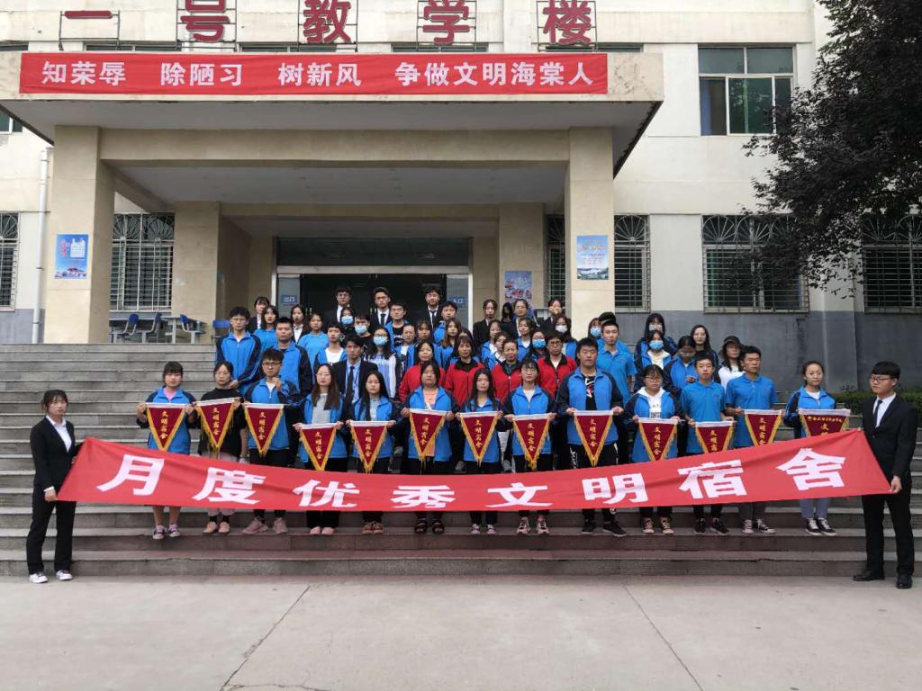 随后,马苏汉、郭平奎、公寓宿管老师为文明宿舍学生授旗。