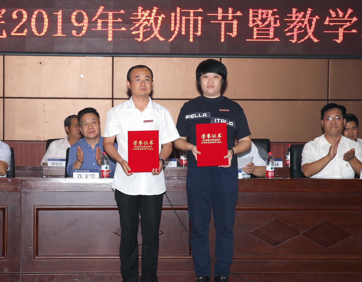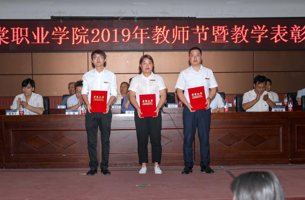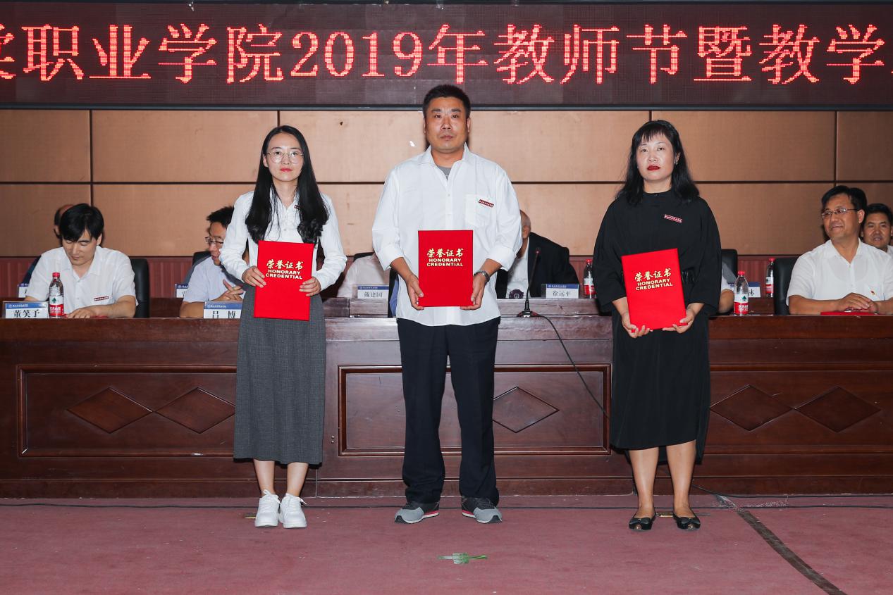 大会中,由教务处李锋利处长宣读《教学表彰通报》和《关于表彰2018-2019学年度“一流教师”的决定》,学院授予王雅台等7名教师“优秀教师”称号;授予李羊忠等3名教师“优秀辅导员”称号;授予张坤宝等2名教师“体育竞赛、大学生心理健康知识竞赛优秀指导教师”称号;授予惠晓明等5名教师“学生技能大赛优秀指导教师”称号;授予刘娟等3名教师“第四届互联网+大学生创新创业大赛优秀指导团队教师代表”称号;授予董文静等5位教师“一流教师”称号。学院领导依次为以上获奖教师颁奖。