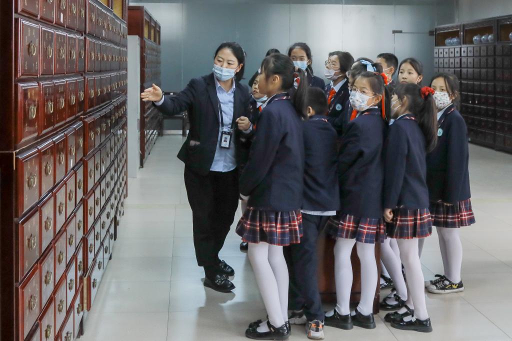 学生近距离体验到中医药的文化精髓,在中药炮制室研学现场,讲解员详细介绍日常生活常见胶囊药的形成,让学生亲身感受“手工胶囊”的制作过程;中药房研学现场,讲解员从中药的用途、识别、判性、通过“鼻闻”“手摸”“眼看”等方法了解常见中药来源。