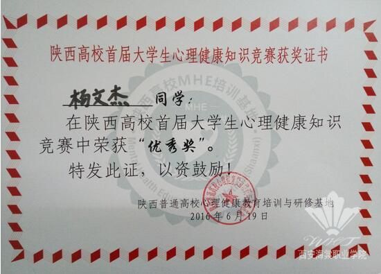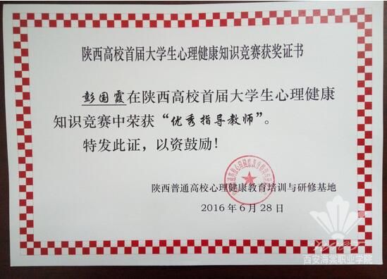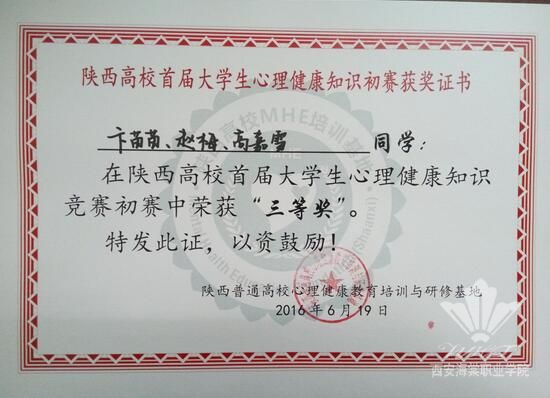 西安海棠学院心理健康教育中心彭国霞老师指导的工造1401班毛兴强、会计1501班卞苗苗、医美1514班赵梅、护理1511班高嘉雪、护理1505班杨文杰等学生组成的代表队参加了本次心理健康教育知识竞赛。通过两天的笔试和机试环节,williamhill代表队最终在本次知识竞赛中取得佳绩,卞苗苗、赵梅、高嘉雪荣获团队“三等奖”,杨文杰获得“优秀奖”,彭国霞老师荣获“优秀指导老师奖”。