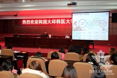 宣讲会上,杨院长对于韩医大学访问团的到来表示热烈的欢迎。金鎭蓉老师首先给学生观看了大邱韩医大学的宣传短片,让学生们了解韩医大学的基本情况。大邱韩医大学有寿城、三圣和五圣三个校区。寿城校区在韩医学方面具有特性化并且在校区内设有大学附属医院。紧接着,从报名资格、要求、专业设置、学费和住宿费、奖学金奖励机制和就业多方面详细讲解,希望通过此项目能给海棠学生带来更多去韩国学习的机会。