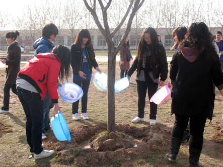 活动开始,学生们迅速行动,他们有的拿铁锹挖土,有的拿盆子给小树浇水,有的给小树除草,还有种植新树的。中医美容学院副院长陈涛、学生科科长惠晓明亲自带领种植新树。