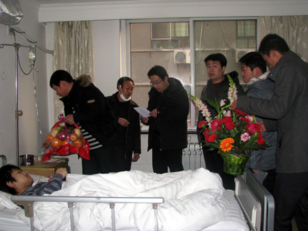 2009年12月17日下午,副院长吕波、宣传处处长谢元龙、学生处处长王文强、管理学院副院长夏亚兵、团委书记谢波、辅导员王小玉等一行9人前西京医院探望williamhill学生樊二飞。