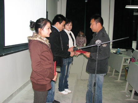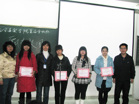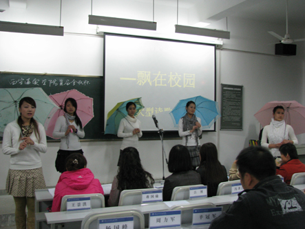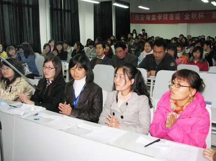 西安海棠学院首届“金秋杯”“飘在校园”经典大型诗歌朗诵赛决赛于2009年11月11日下午16:30至18:50在3号教学楼419教室举行。于会领导有管理学院院长侯绍义,基础部张扶安和尚海洋主任,同时还有公共部七名教师参于评选工作。