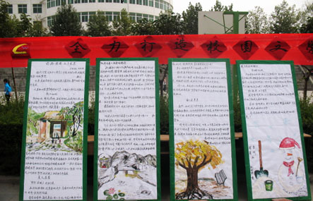 2009年10月19日中午12点,记者来到篮球场边,映入眼帘的是路旁整齐的摆放着的展板。展板上张贴的是学生的优秀作品,路过的同学们不约而同的聚集在各个展板前,仔细认真的欣赏展出的优秀作品,很多欣赏者对一些作品表现出了浓厚的学习兴趣。