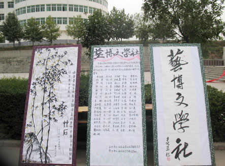 据艺博文学社副社长刘向东介绍,本次作品展将维持四天。展品是艺博文学社向全院征文,并经过选拔选取的70份作品。此次优秀作品展共有展板20块,其中17块的主要内容是优秀的文章作品, 3块的主要内容是优秀的绘画作品。
