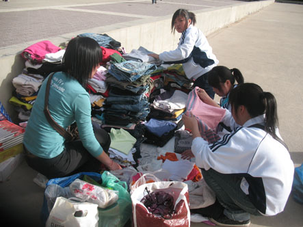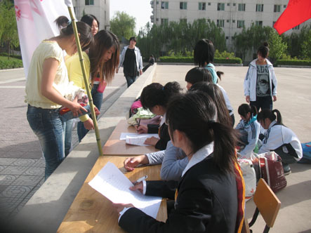 本次活动中捐赠衣物的学生很多,他们把自己用过的书籍,穿过的衣服等物品都捐了出来,有的同学甚至把自己喜欢的玩具也奉献了出来。胸部佩戴红色条幅的学生会负责人很热情的登记,并将所捐赠的物品整理好。