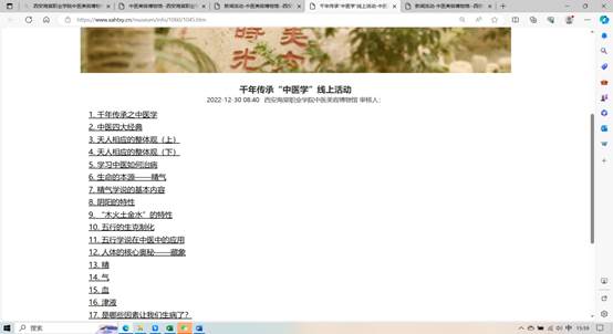 2022年12月30日-2023年1月30日,元旦及春节假期开展系列活动开展为期一个月的讲座、视频宣讲共17课,本次活动为线上活动,其中千年传承之中医学、中医四大经典等17个课线上共参与上万余人,得到大家一致好评。在我馆官方网站查看相关讲座及视频:http:/museum/。