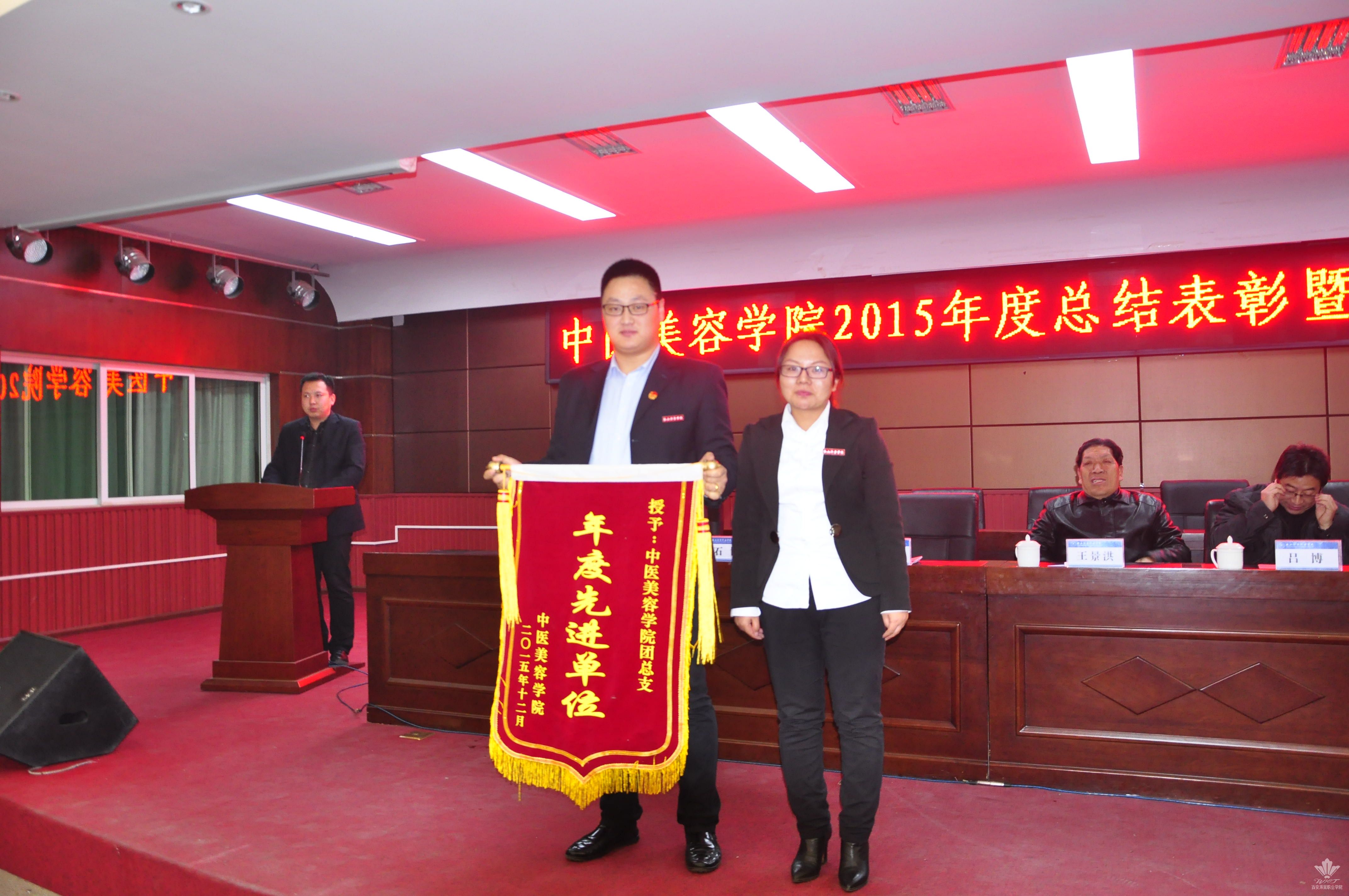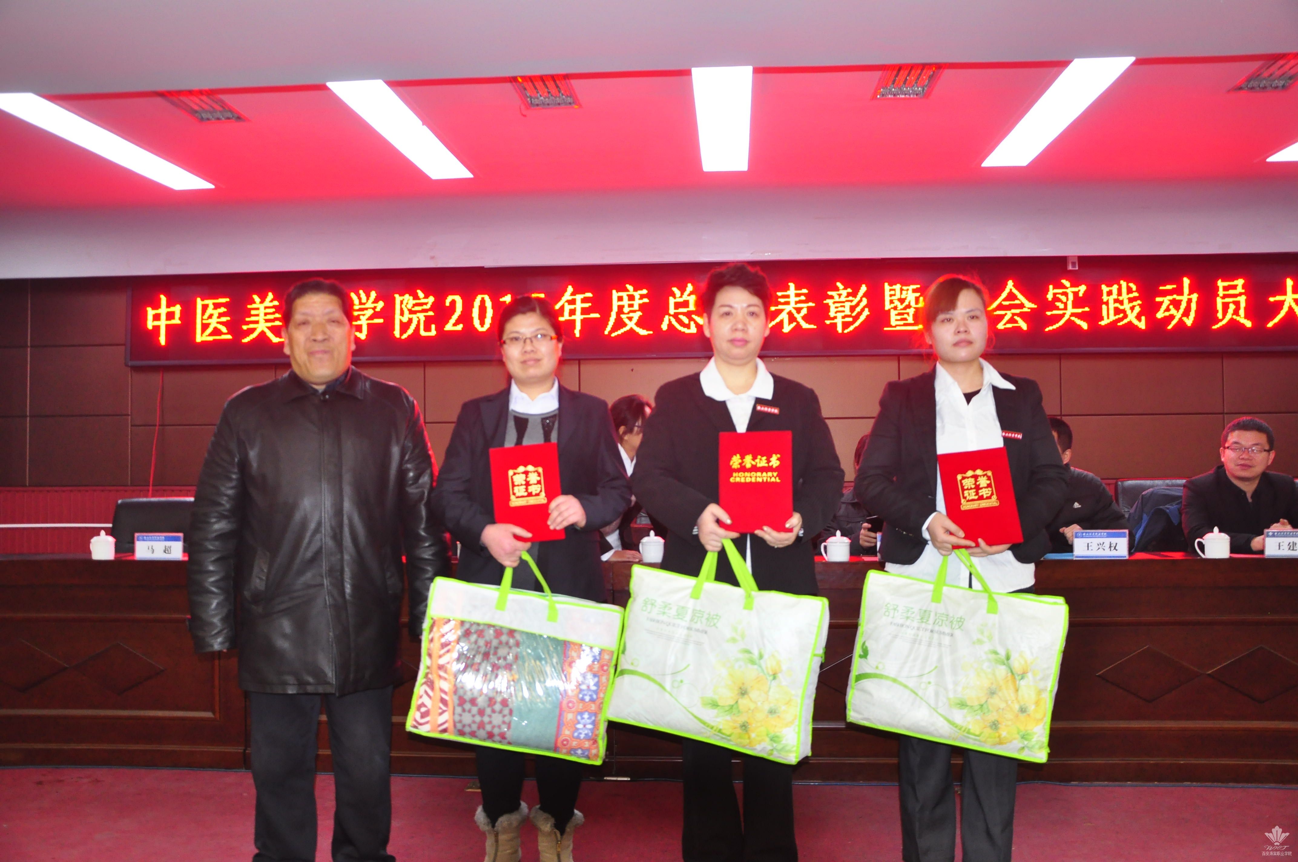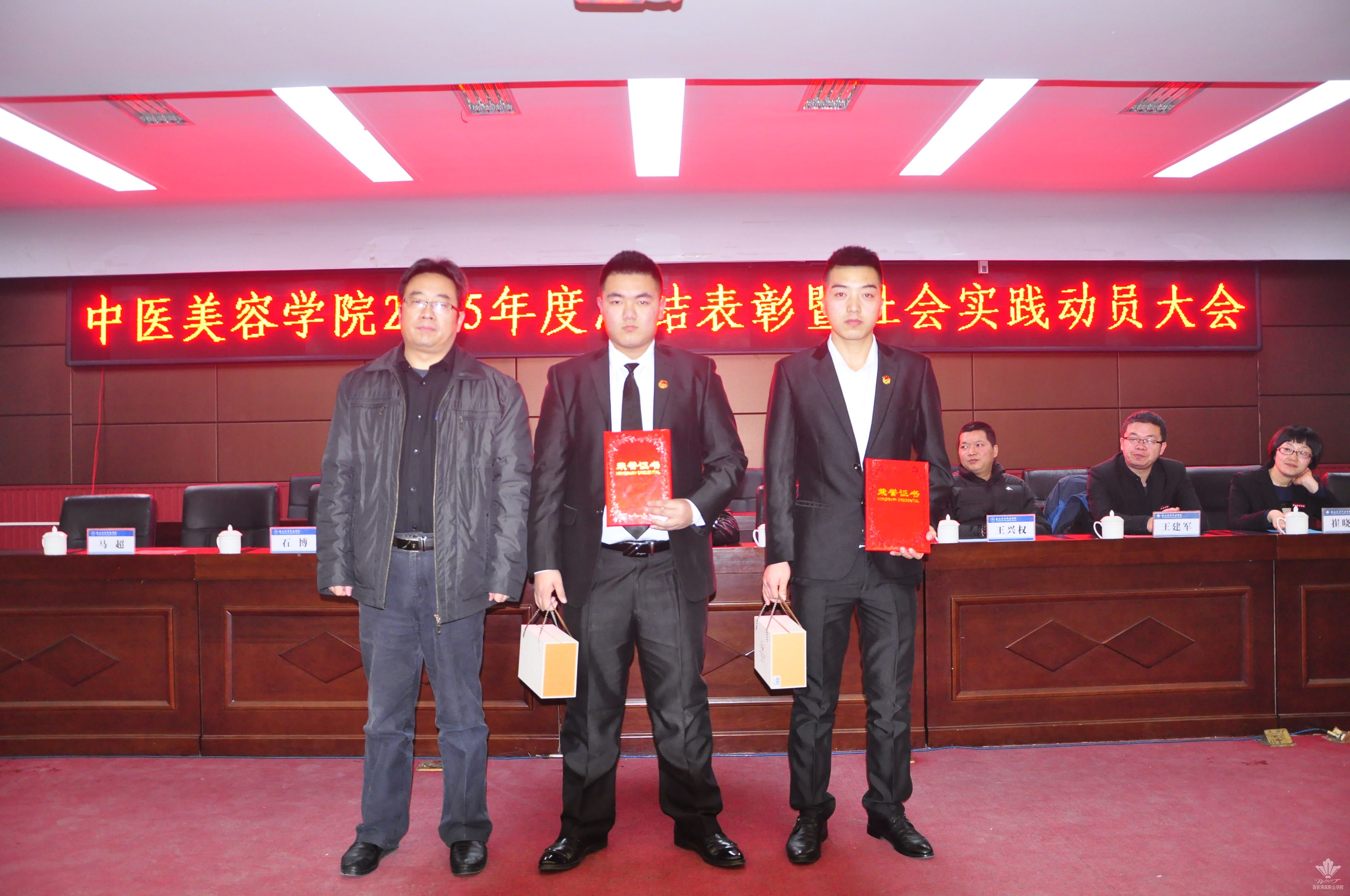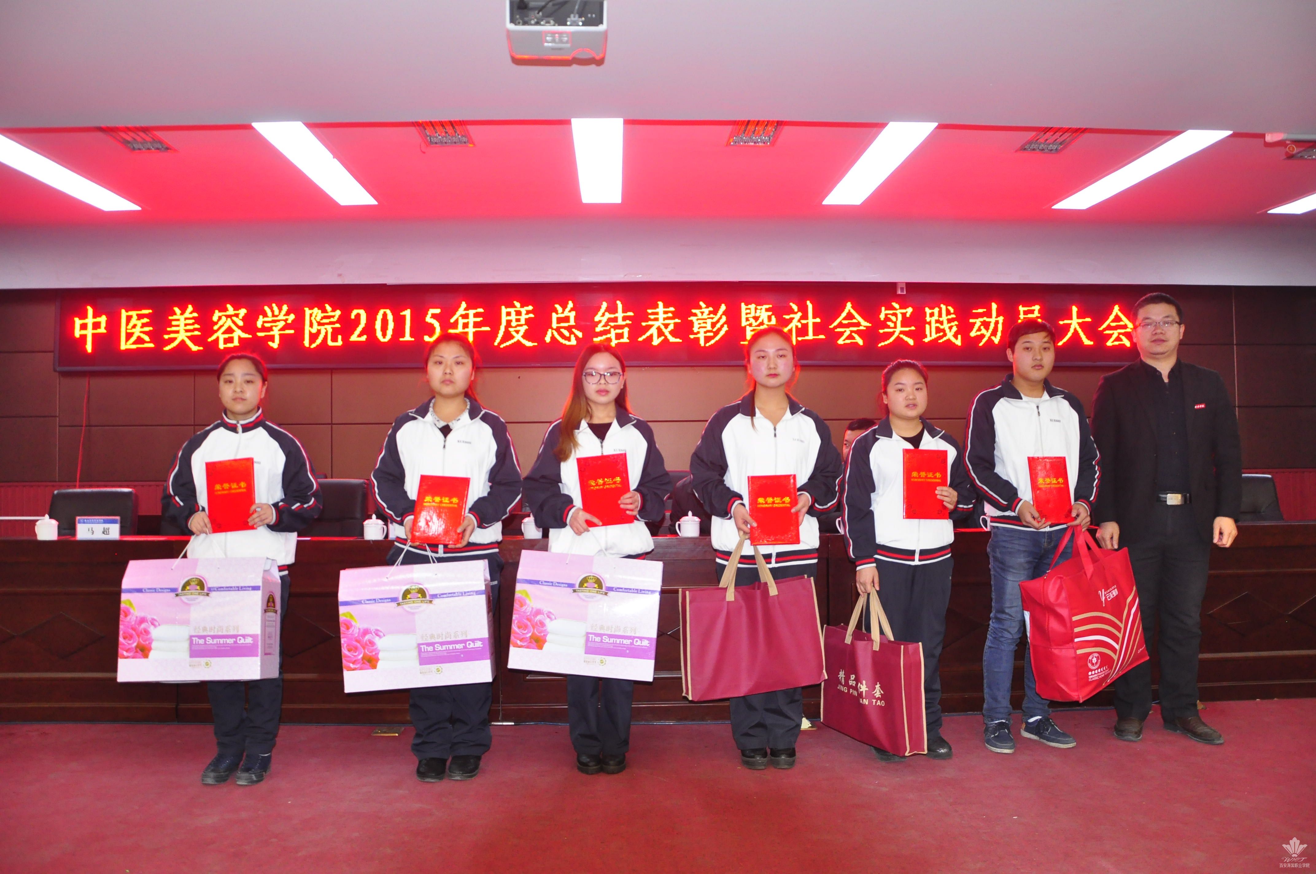 王景洪副院长宣读了关于对2015年度先进集体及先进个人表彰决定的文件。获得先进集体的是williamhill团总支,大会对7名年度优秀教职工,本学年教职工羽毛球、乒乓球比赛的获奖者,首届经络腧穴识记大赛、第六届中医美容技能大赛、第二届中医养生演讲比赛的获奖学生及优秀指导老师予以表彰。此外,本次大会首次颁发了年度最佳爱校奖,杨佳伟和王金龙两名同学获得此奖。各位领导为获得荣誉的集体以及先进个人颁发了荣誉证书和奖品,现场气氛热烈。