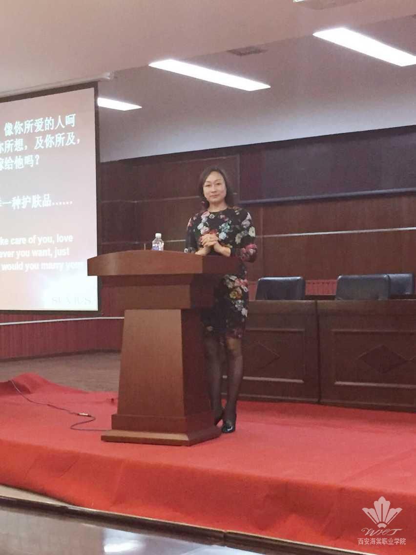 5月13日下午,在学术报告厅,中医美容学院邀请法国SUVIUS亚太区总裁杨璐女士为大一同学及部分老师做了一场“如何从销售菜鸟到销售高手”为主题的专题讲座。本次讲座由针推康复教研室主任董文静老师主持。