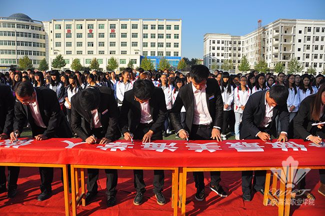 海棠学院团委书记石博宣布中医美容学院素质教育系列活动正式启动,全体师生争相在“认真践行素质教育、争做最美海棠人、做适应社会发展的创新型高技能人才” 宣传标语上签名。(文/刘姗姗)