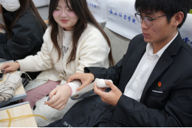 王教授首先详细讲解了外伤止血包扎的基本步骤和技巧,并通过实际案例和现场演示,让师生们直观地了解如何正确处理各种外伤。师生们纷纷上台实践,亲身体验了包扎过程,进一步掌握对外伤止血包扎的方法。