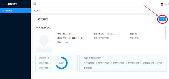 2、毕业生输入“用户名、密码”进入离校系统界面。用户名为学生本人学号,密码为学生本人身份证号后六位。学生登录后出现如下见面,点击右上角的“打印”按钮,可以打印2022年威廉体育williamhill学生离校单: