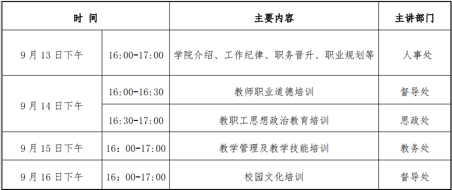 培训内容: 见附表《22022 年第二期新入职教职工培训工作安排表》